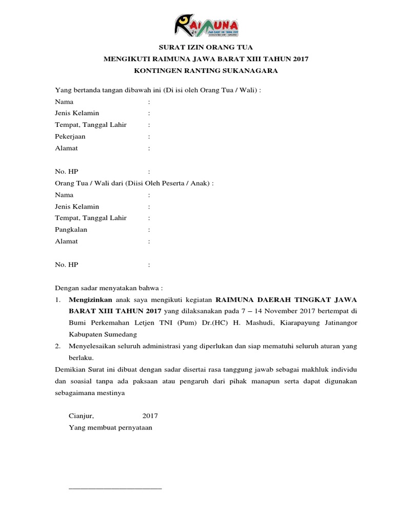 Surat izin orang tua yang bertanda tangan dibawah ini kami : Pembuka pembuka surat biasanya berisikan dua baris kalimat utama yakni salam pembuka. Winda astutitempat, tanggal lahir : Walaupun sudah tersedia berbagai komunikasi canggih dan modern sekarang menulis surat izin dari orang tua tidaklah begitu susah dan mungkin sudah merupakan hal yang biasa bagi sebagian orang. Ada banyak sekali jenis surat izin orang tua, baik itu untuk keperluan kerja, sekolah, kuliah, kegiatan organisasi dan masih banyak yang lainnya.
