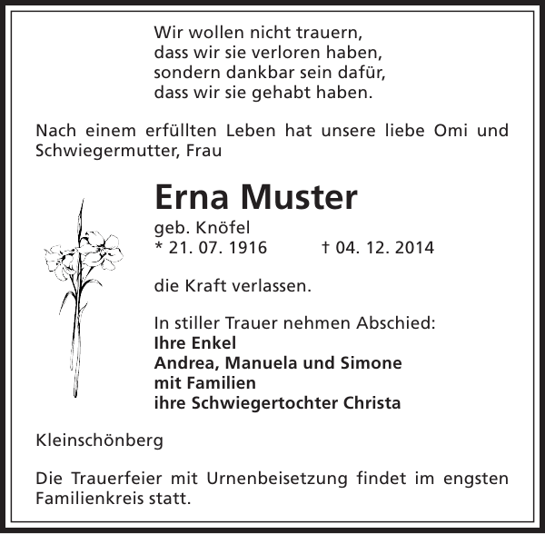 Hier finden sie aktuelle traueranzeigen und todesanzeigen. In vielen trauerfällen wünschen die angehörigen eine traueranzeige, um öffentlich an den verstorbenen zu. Traueranzeige f извеще́ние о сме́рти. Aber was gehört in eine todesanzeige? Donau g�nzburg kempten (allg�u) kaufbeuren lindau (bodensee) memmingen. Vor jahrzehnten geschah dies noch persönlich. Vorlage traueranzeige wir haben 20 bilder über vorlage traueranzeige einschließlich bilder, fotos, hintergrundbilder und mehr. Zweifelsohne gibt es schönere anlässe für ein dankeschön. Aktuelle todesanzeigen, traueranzeigen, danksagungen und jahresgedächtnisse aus vorarlberg von den vn todesanzeigen. Suchen sie nach aktuellen traueranzeigen aus ganz deutschland und finden sie rat und unterstützung wenn sie einen trauerfall haben. Vor jahrzehnten geschah dies noch persönlich. 34 wunderbar vorlagen für traueranzeigen modelle. Suchen sie nach aktuellen traueranzeigen auf ihrem regionalen trauerportal.